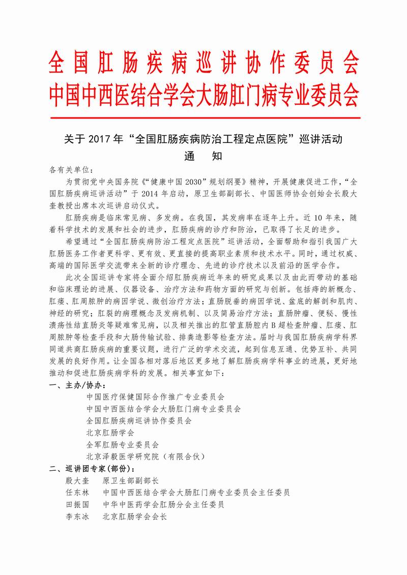 2017年“全国肛肠疾病防治工程定点医院”巡讲活动通知