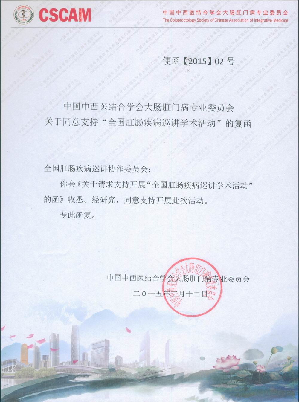关于同意支持“全国肛肠疾病巡讲学术活动”的复函
