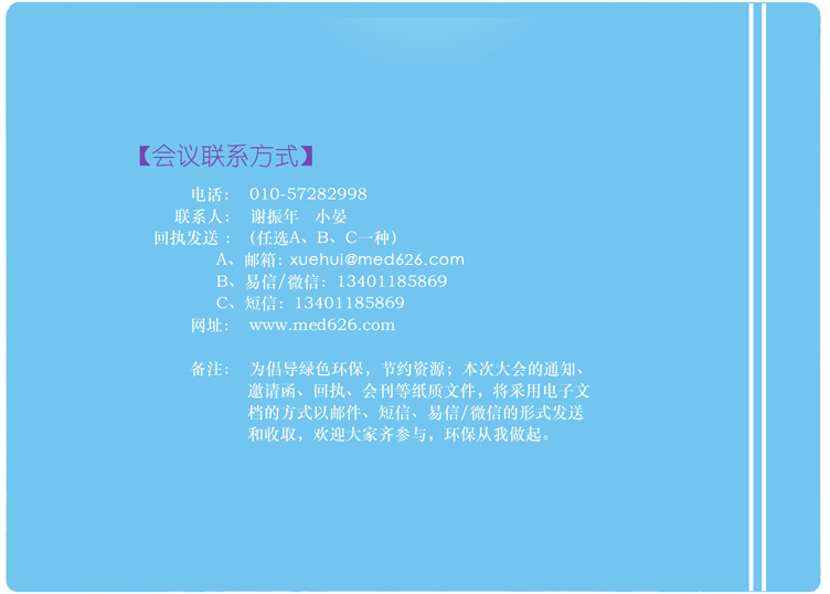 2、为倡导绿色环保,节约资源;本次大会的通知、邀请函、回执、会刊等纸质文件,将采用电子文档的方式以邮件、短信、易信/微信的形式发送和收取,欢迎大家齐参与,环保从我做起。